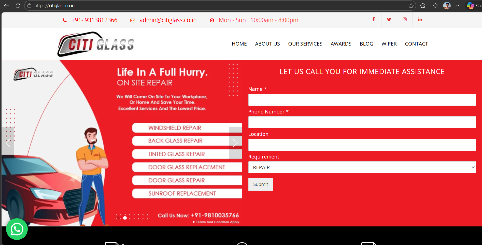 Citi Glass is a professional service platform specialized in automotive glass repair and replacement. The website is designed for high-speed lead generation.