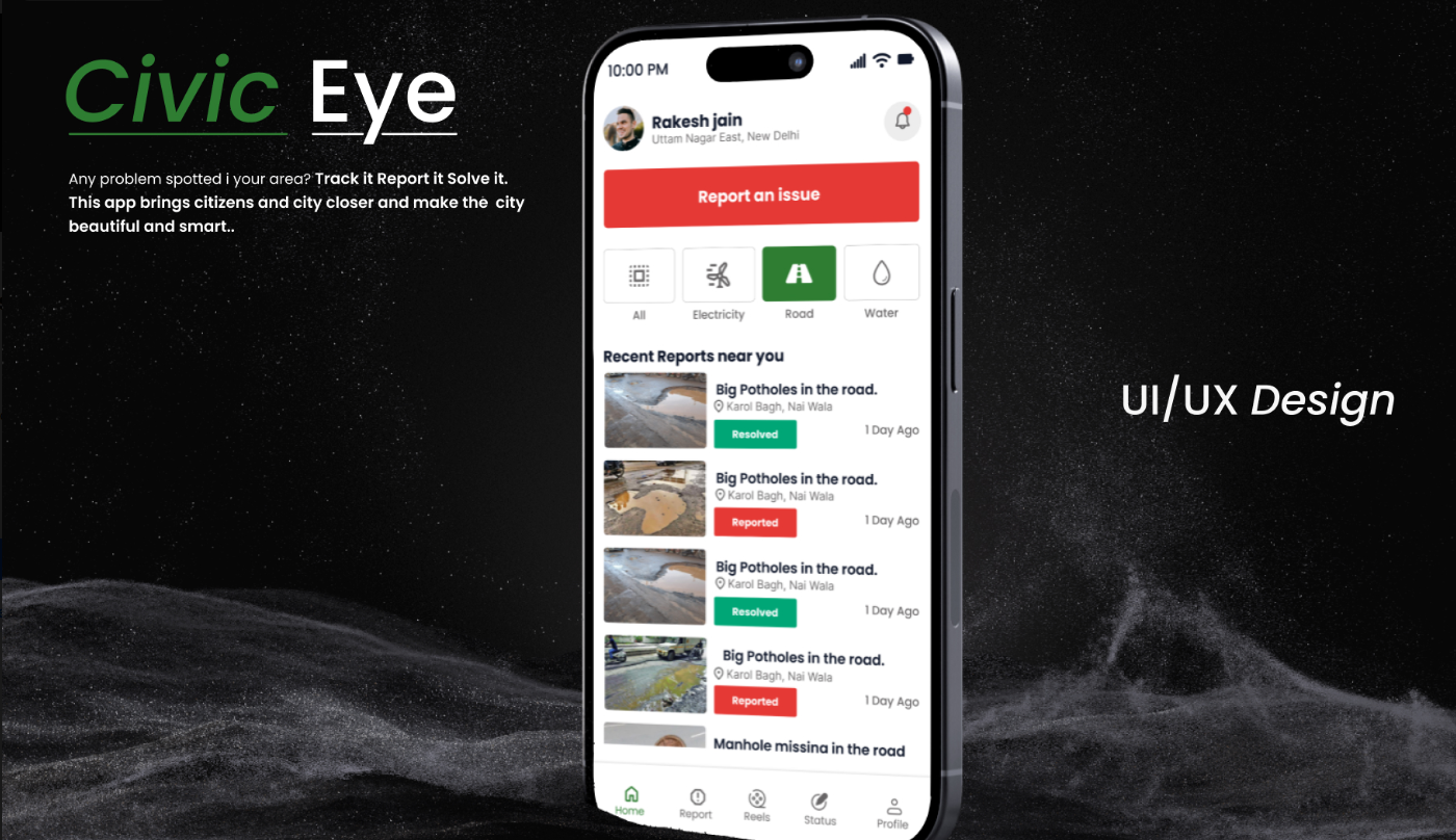 A citizen-led civic issue reporting app. Users can report problems like drainage or electricity, track status, and connect with local authorities.